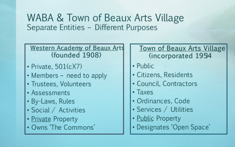 Have a question or request? Wondering if your question should be directed to the Town of Beaux Arts Village or the Western Academy of Beaux Arts (WABA)? This chart may help you decide: